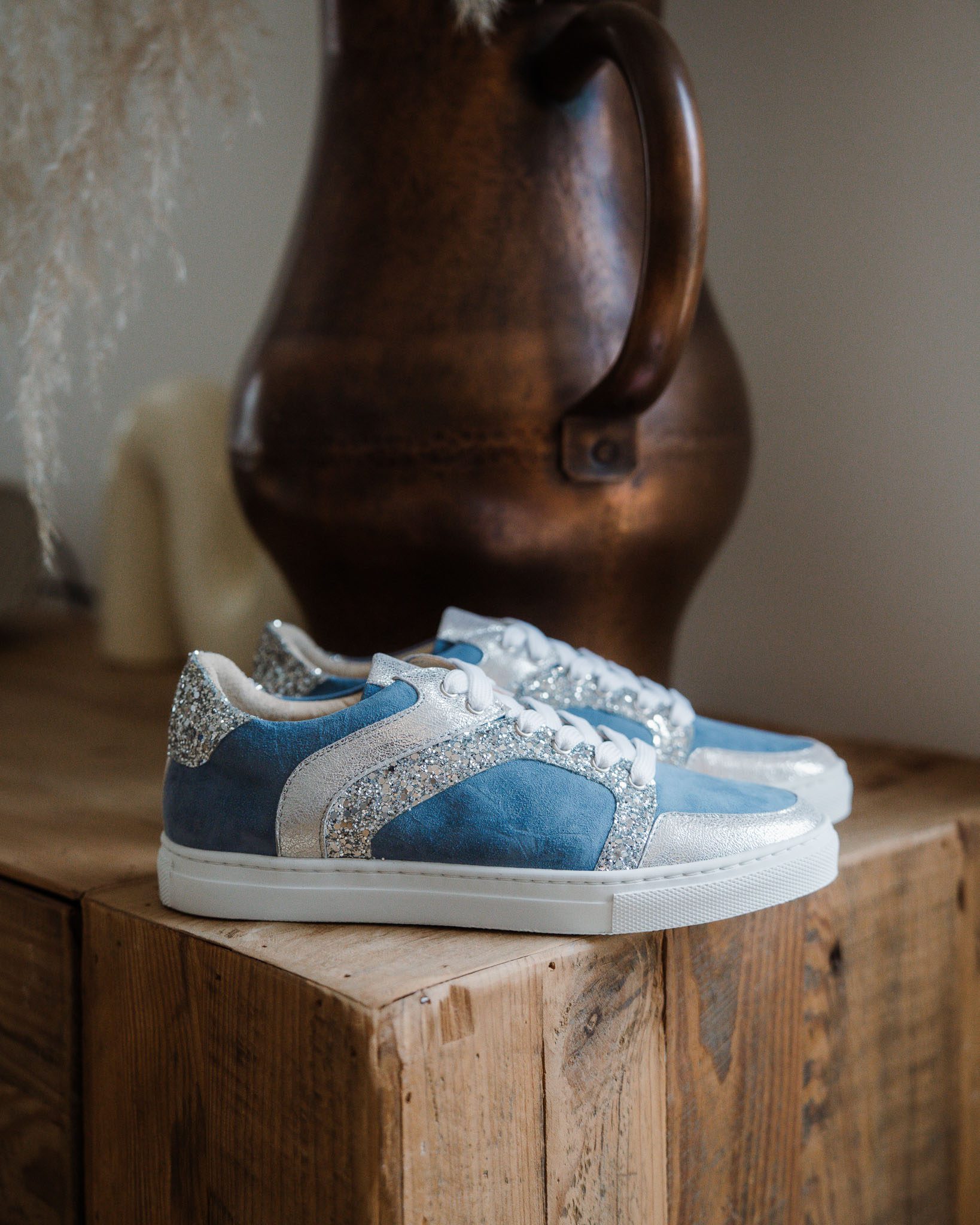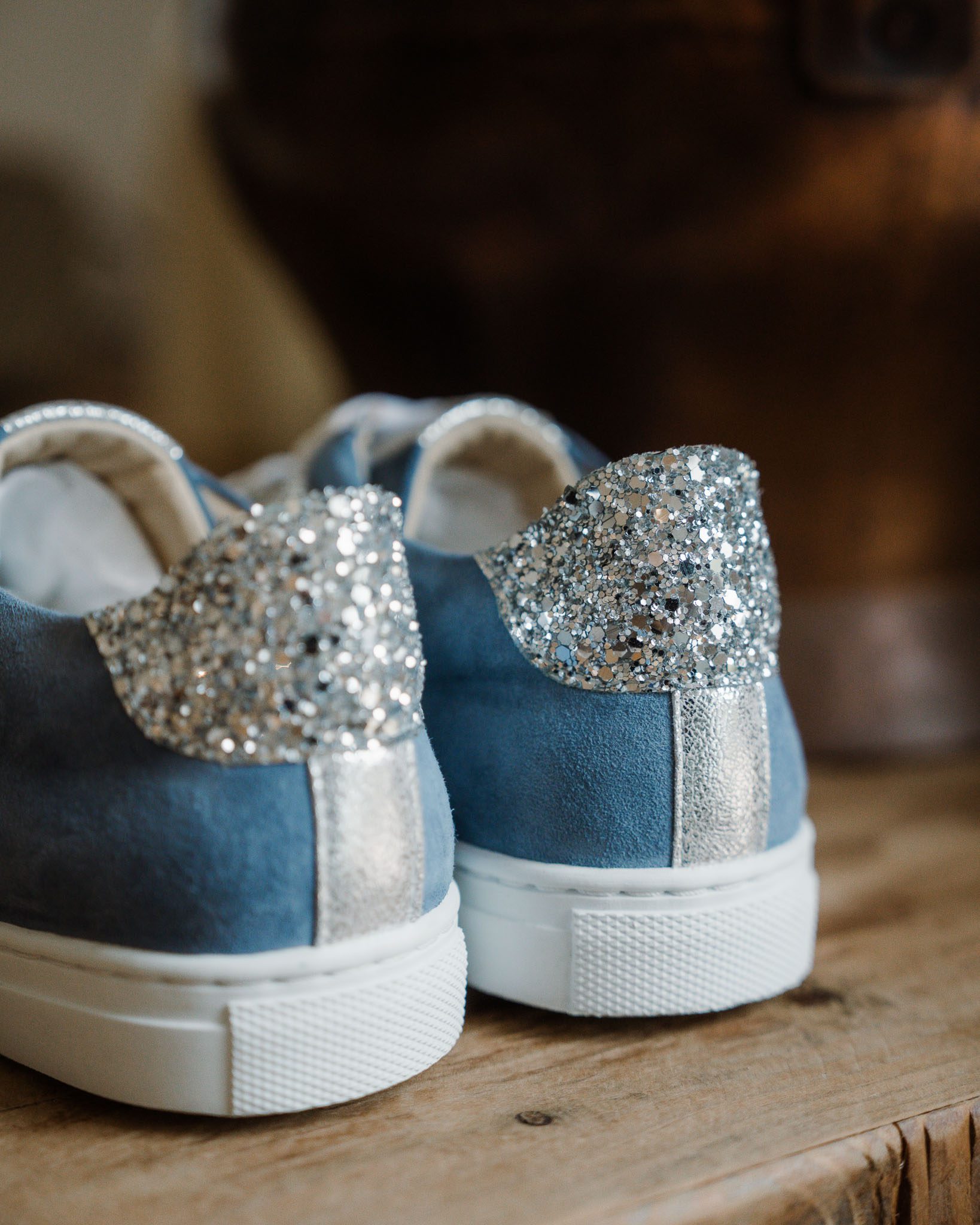Basket personnalisée Oscar en velours bleu gris, détails en cuir irisé et glitter argenté.