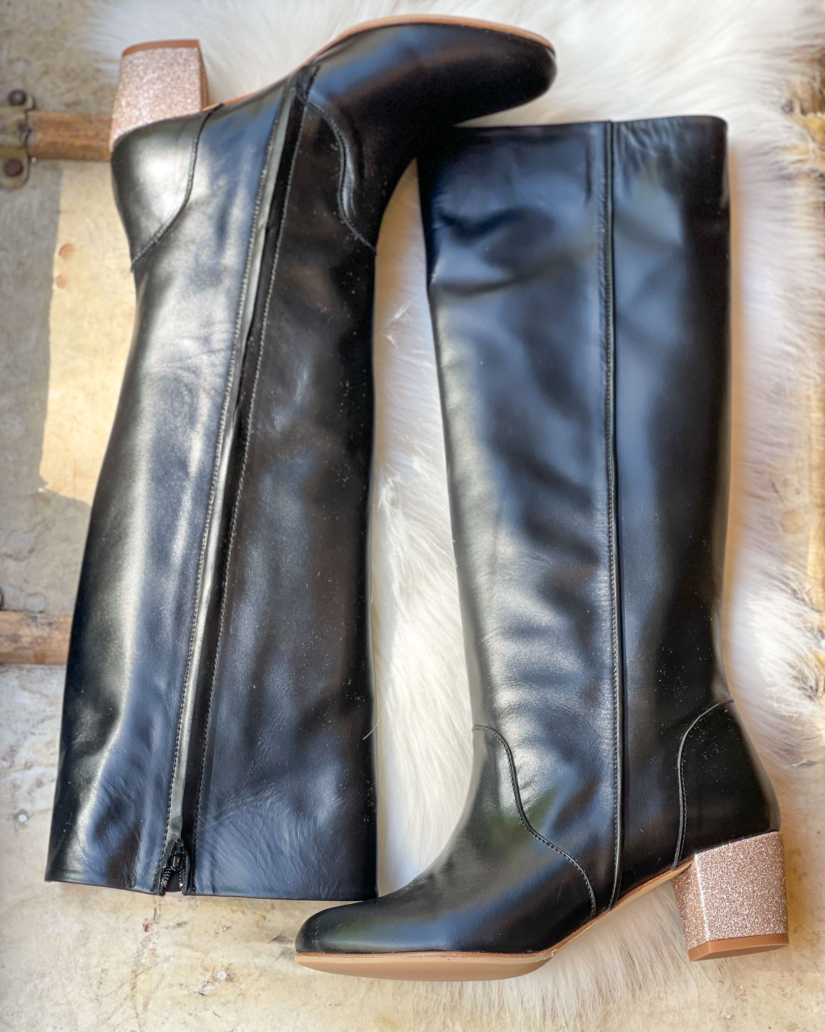Black leather boots with blond gold sequins - 230.00