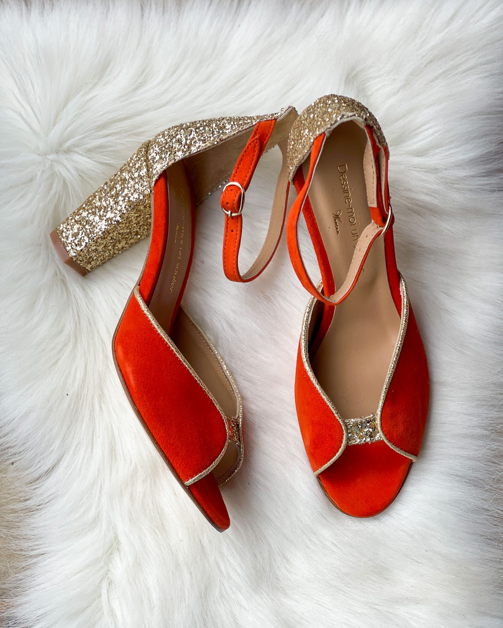 Sandale Charlotte bis en velours orange fluo, glitter champagne.