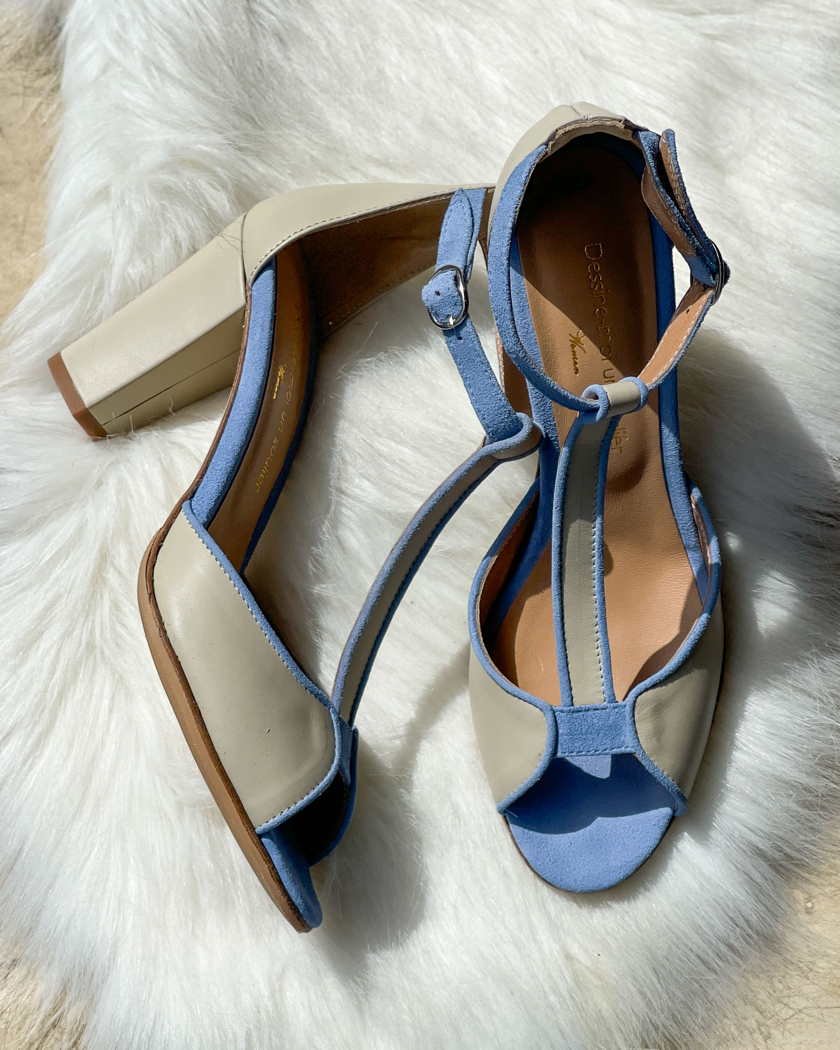 Sandale Charlotte en cuir lisse blanc cassé et velours baby blue.