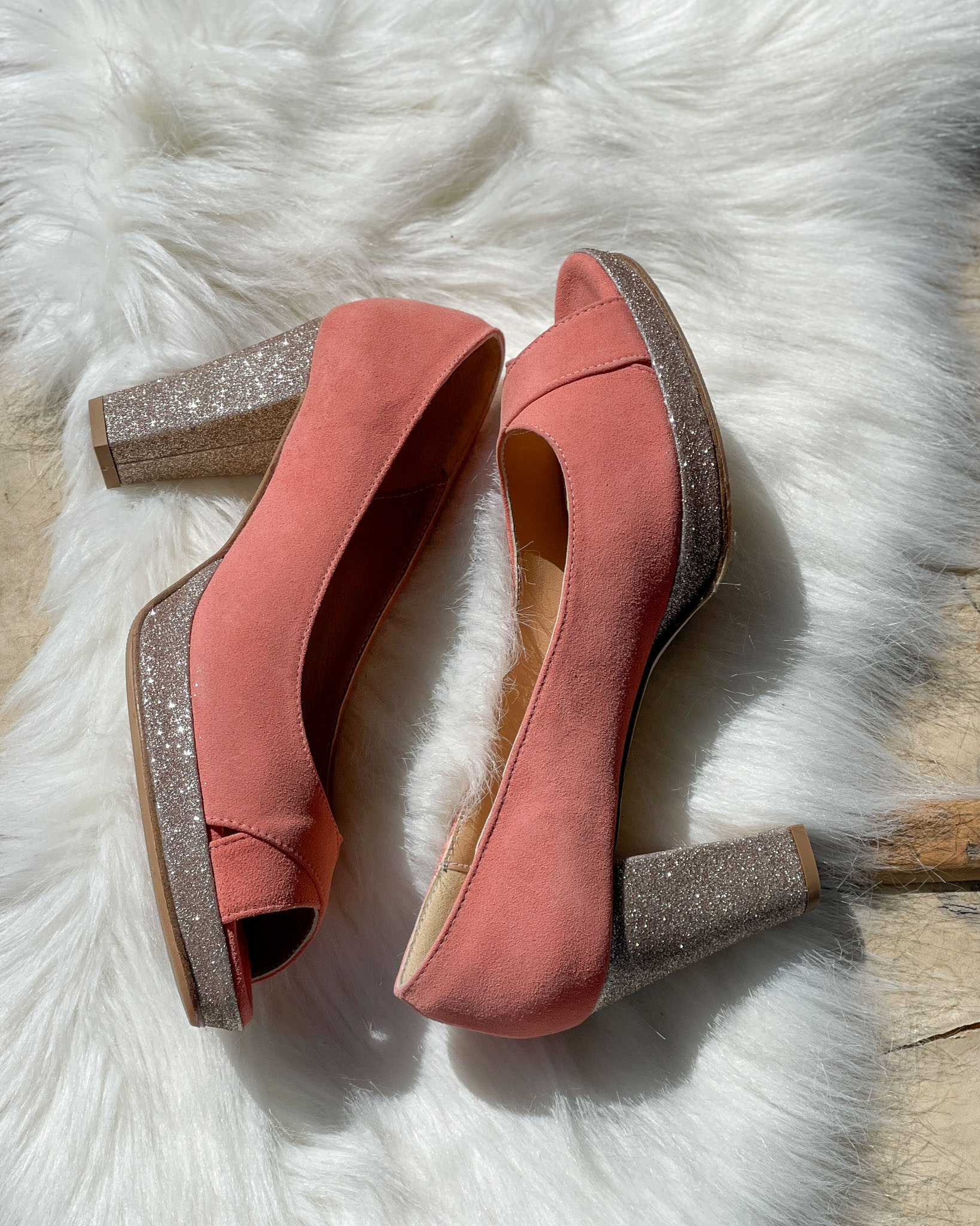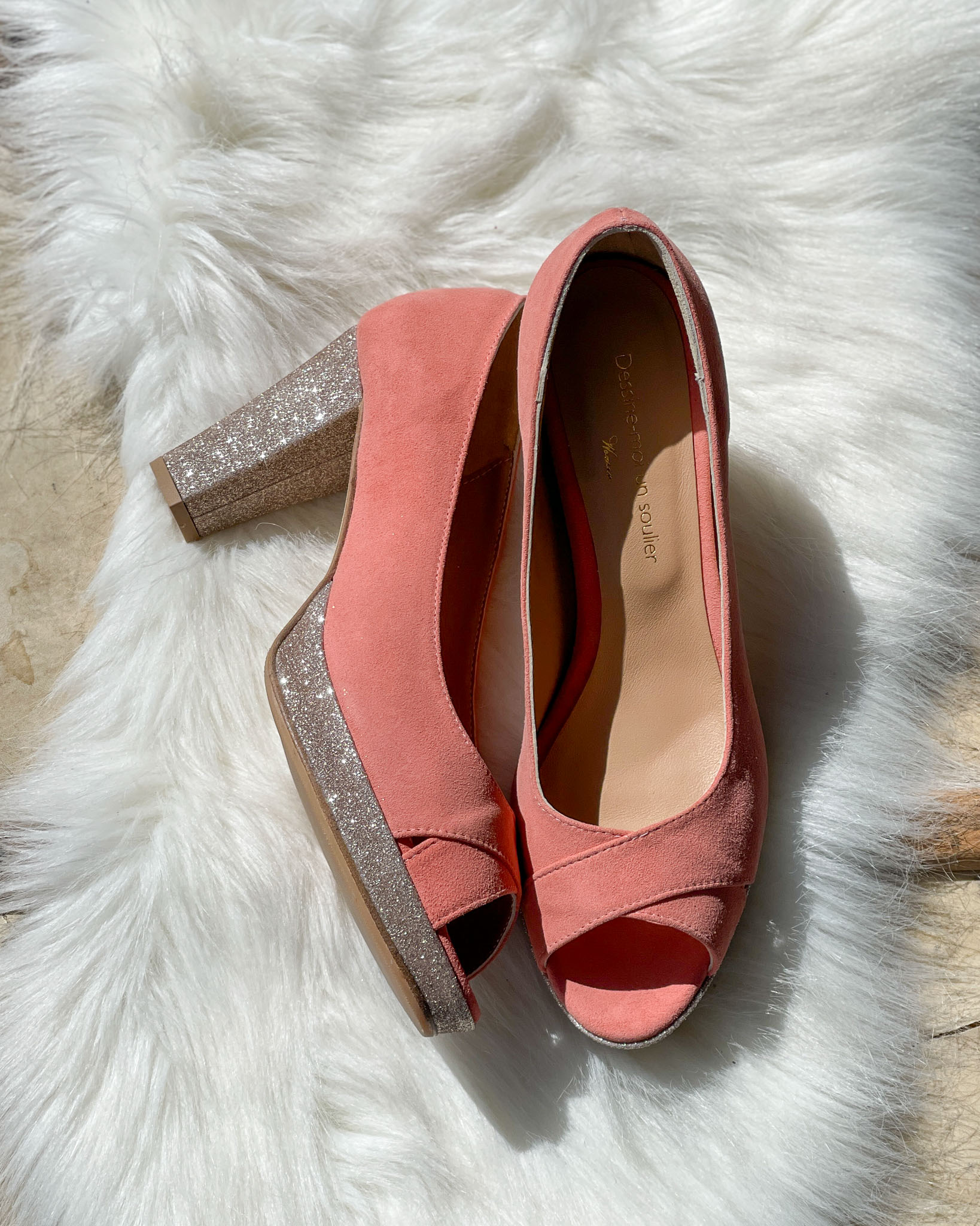 Escarpin plateforme en velours corail clair et fine paillette or blond et talon 10 cm chunky
