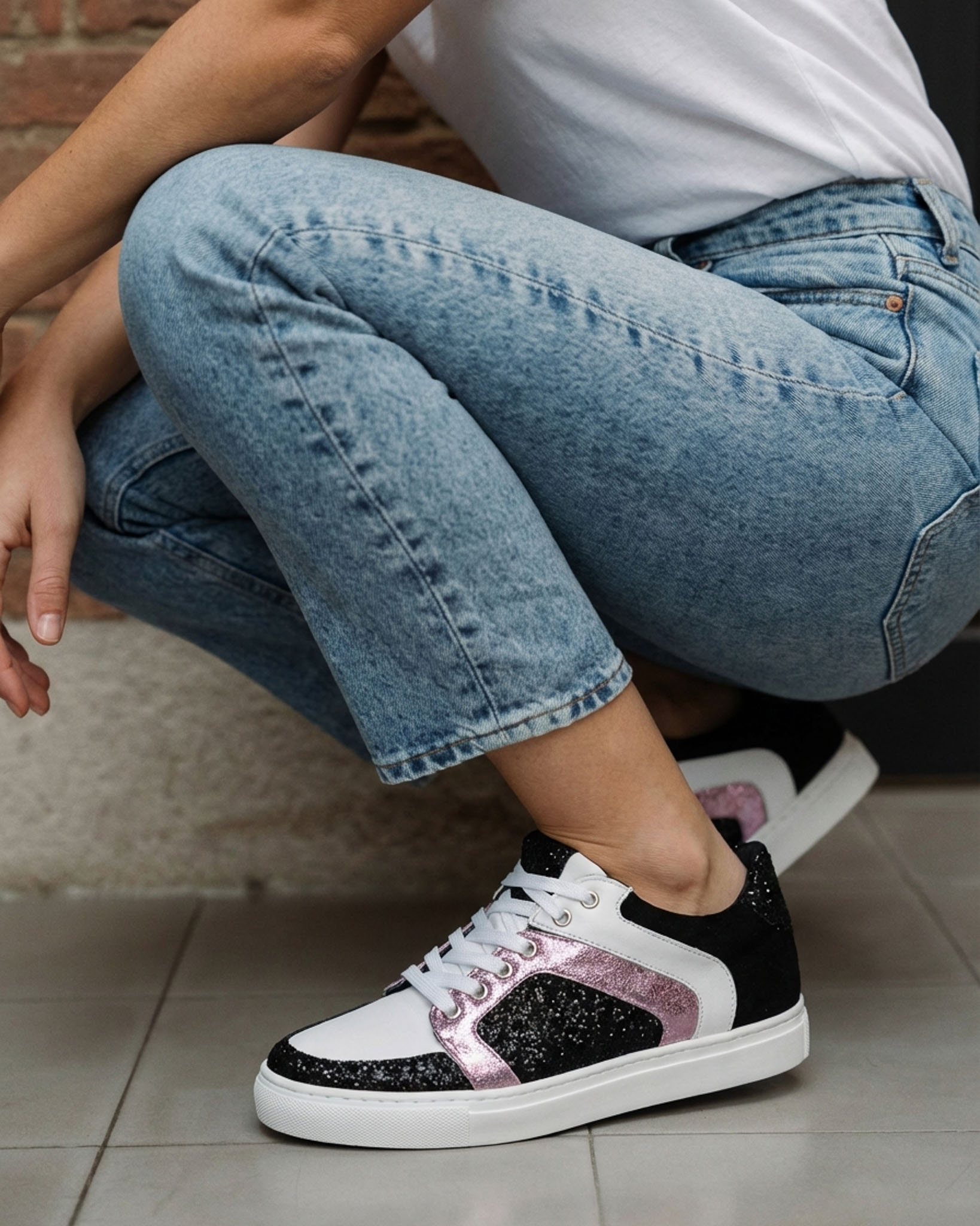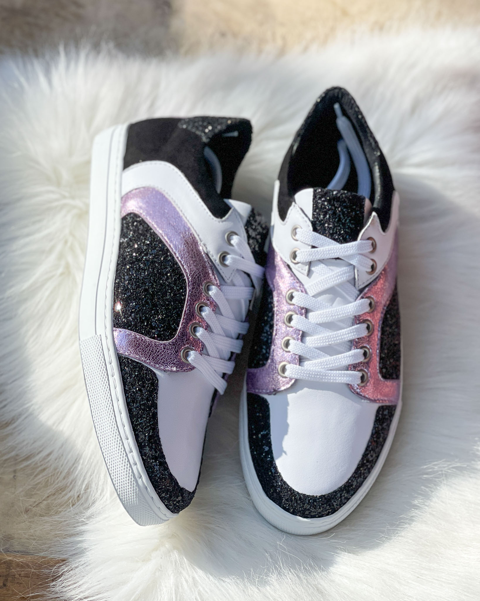 Baskets en cuir lisse blanc, glitter noir, irisé lilas.