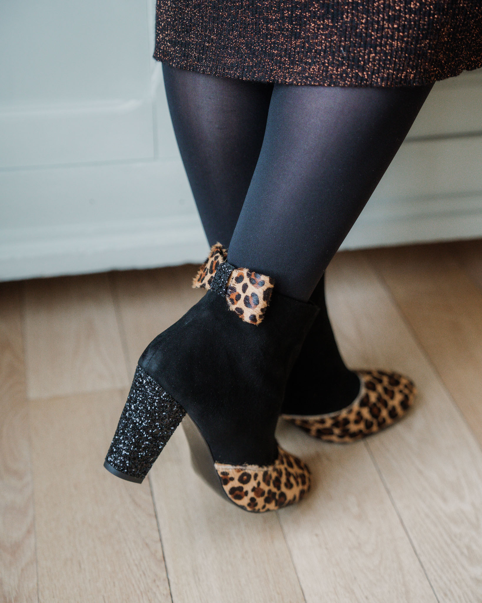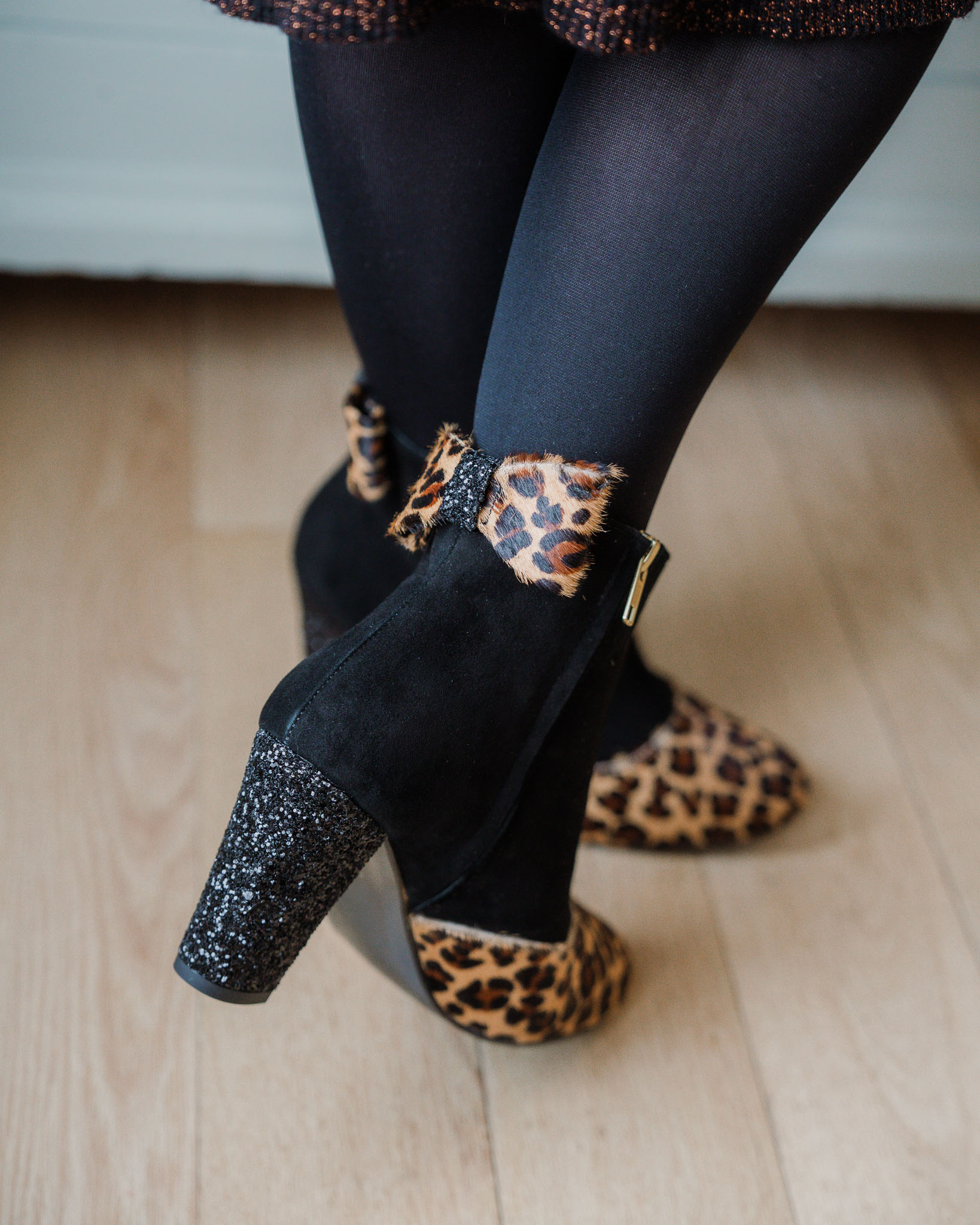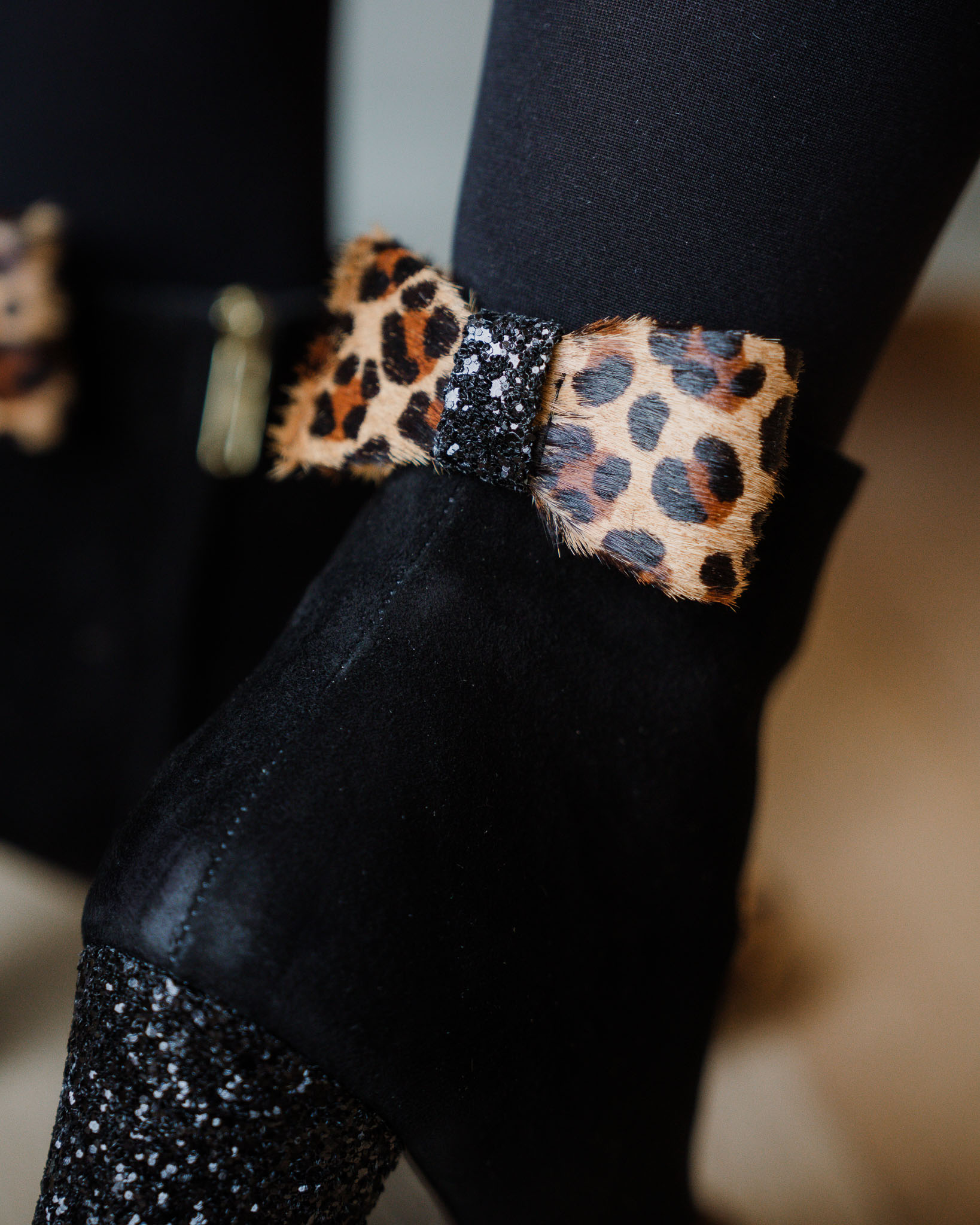 Bottines en velours noir, glitter, poil léopard - €340.00