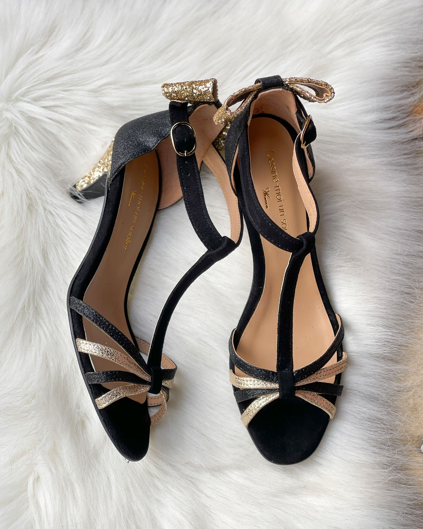 Sandale Chloé en paillettes noires et champagne.