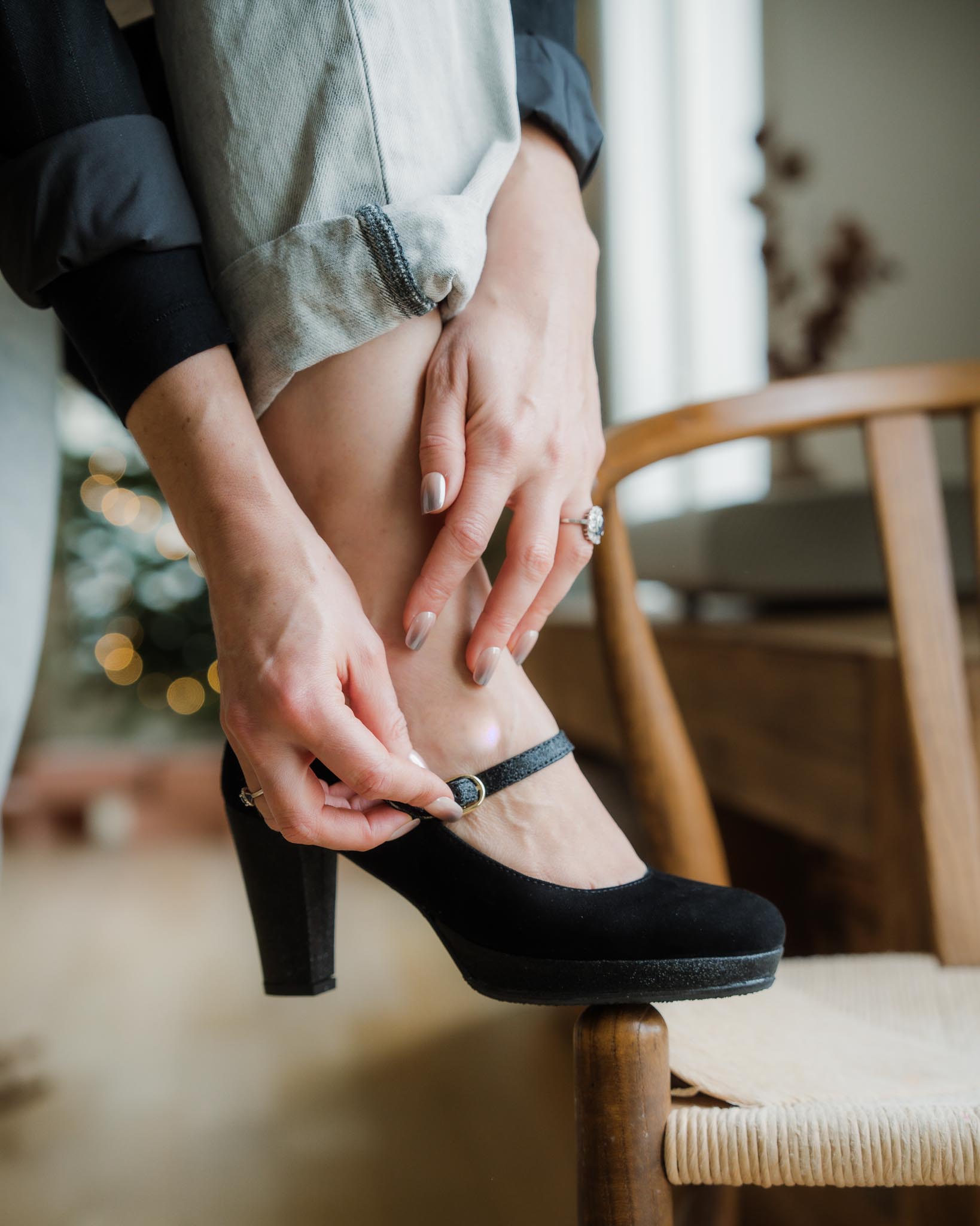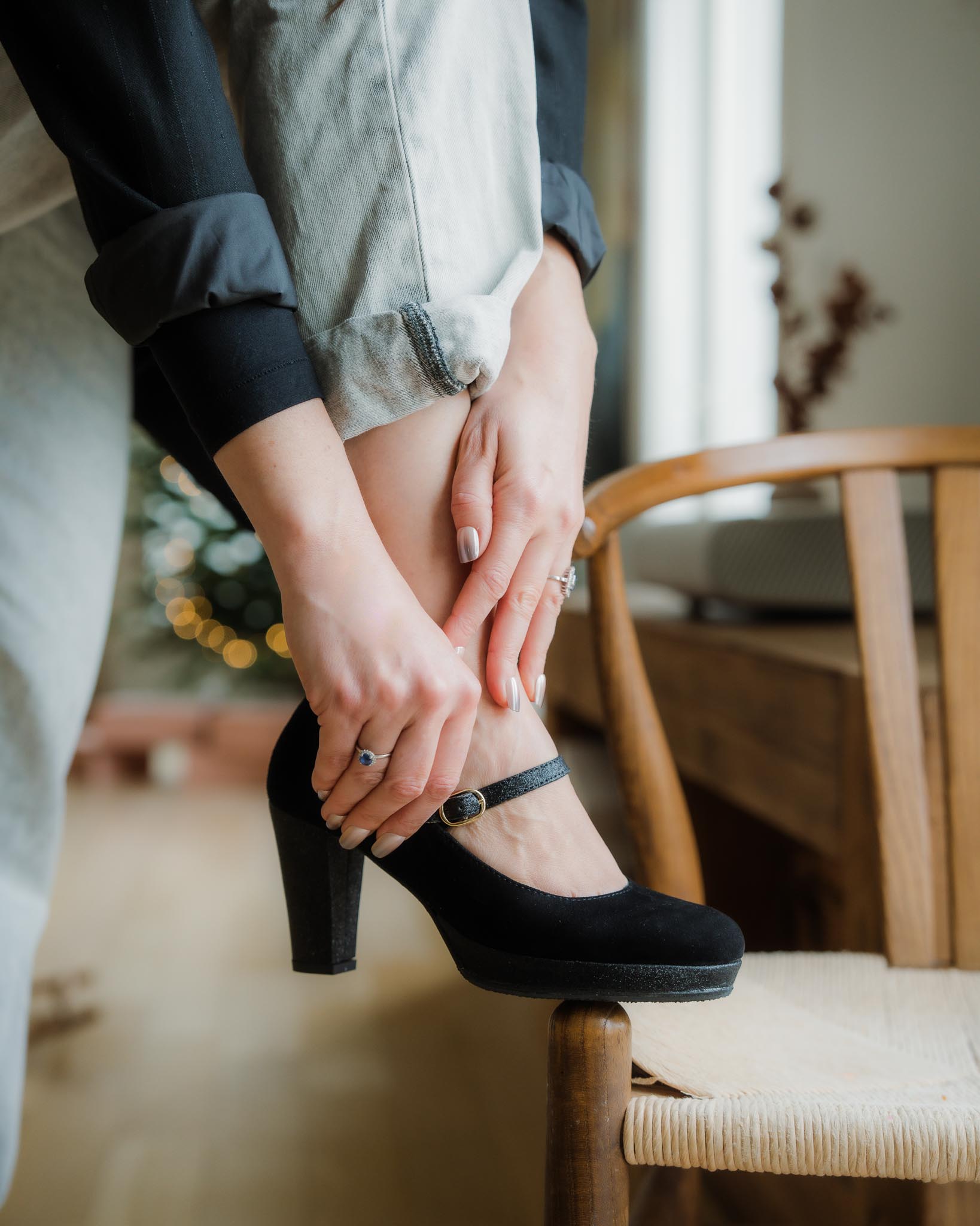 Bride marie jeanne, talon de 8 cm chunky en fines paillettes noirs.