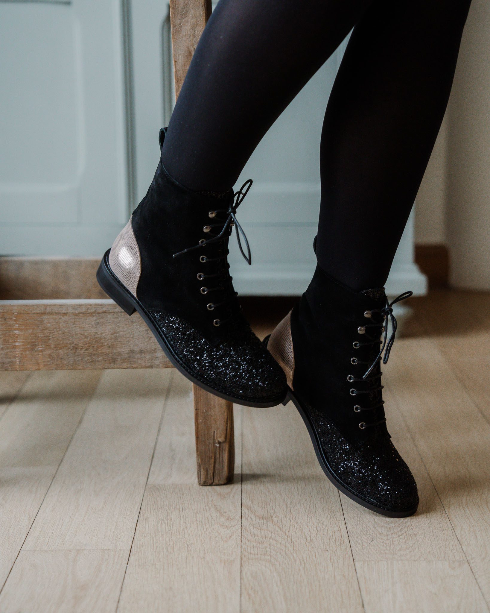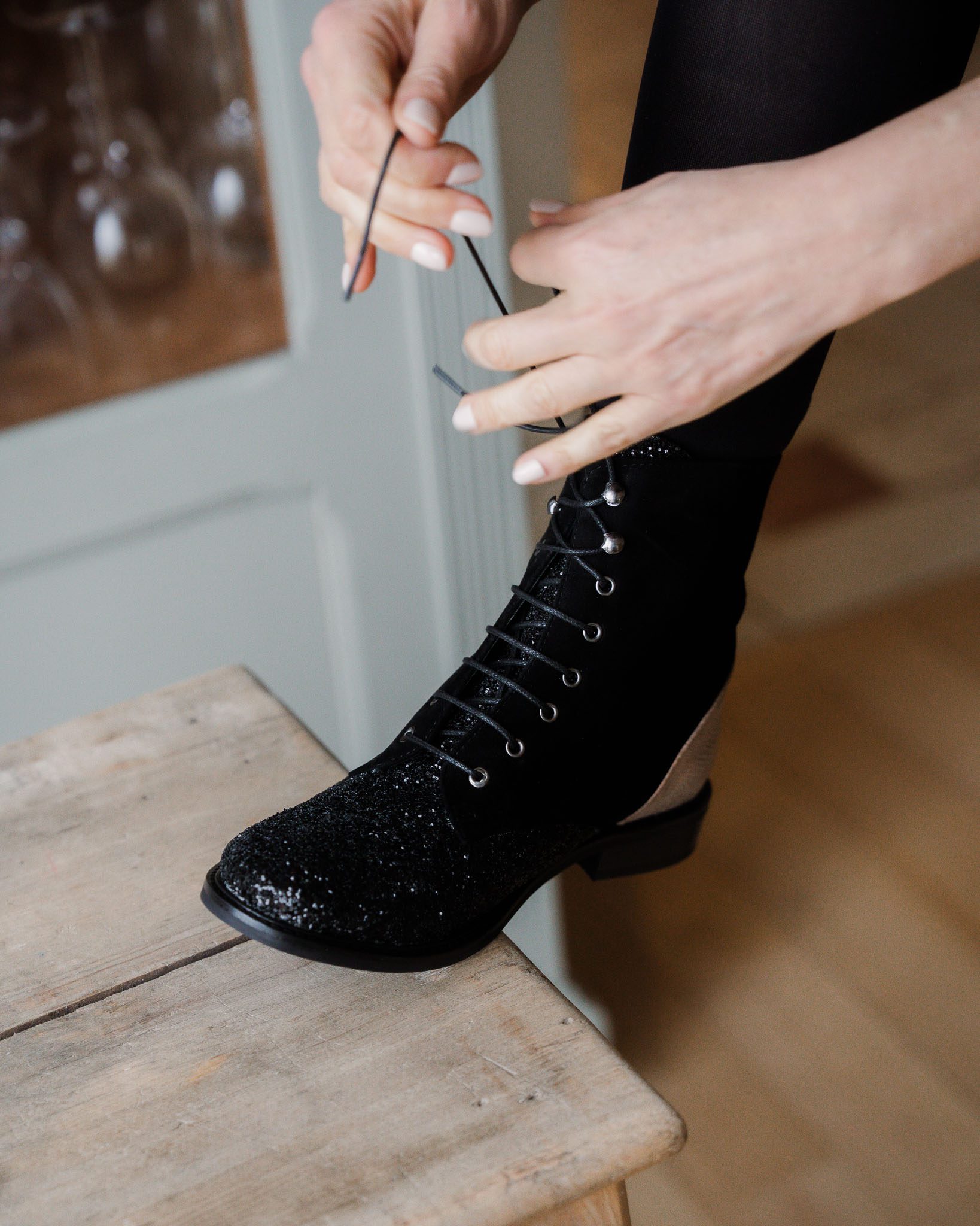 Bottine Billie en velours et glitter noir, irisé or rose;